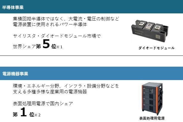 1933年の創業以来、パワー半導体とその応用製品である電源機器の専門メーカーとして産業界の発展に大きく貢献してきました。現在は、映写機用電源やメッキ用電源で国内トップシェアを獲得しているほか、燃料電池用パワーコンディショナ、蓄電システム用インバータなど、エコエネルギー時代を支える製品を送り出しています。